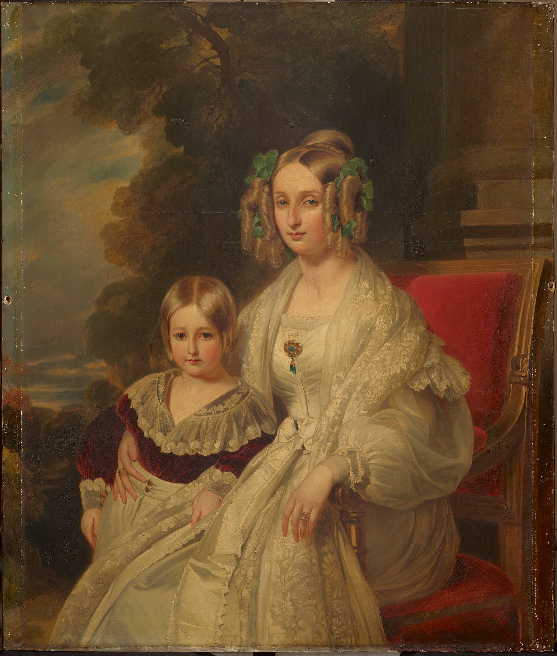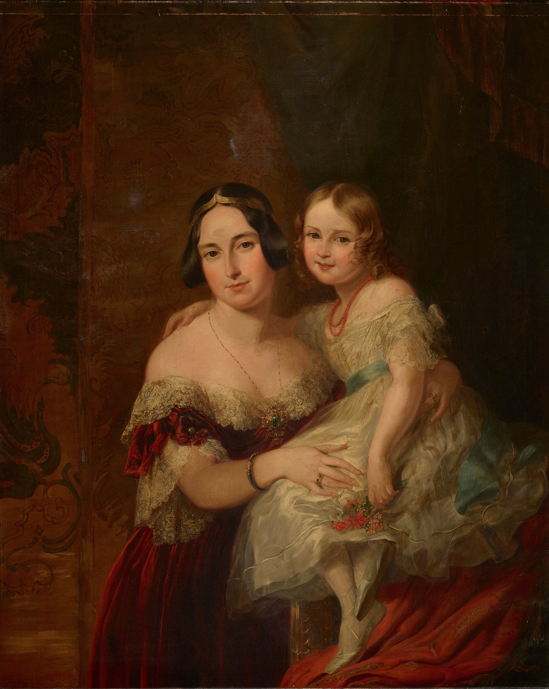 The Marble Hall was designed for the display of marble sculptures, but it also contains an array of paintings, furniture, and vases. These paintings were made at different times by more than one artist, so were not originally designed as a set – but they have been displayed together for over a century. Among the sitters are Queen Victoria’s mother, the Duchess of Kent, and the Queen's half-sister Princess Feodora. Rather than being displayed in traditional picture frames, four of the paintings are installed directly in the architectural panelling of the Marble Hall at Buckingham Palace.
