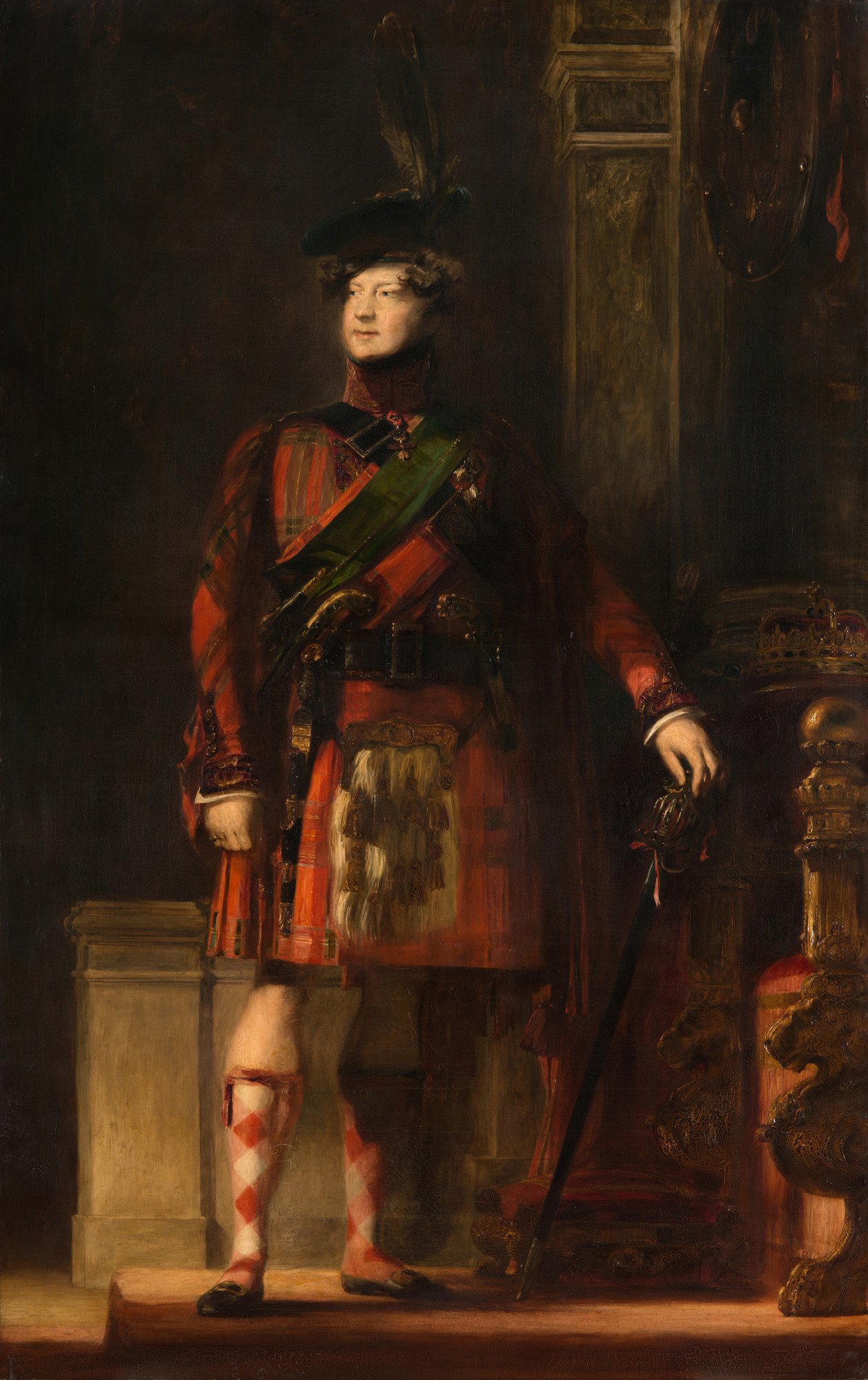 George IV succeeded his father as King in 1820 and in August 1822 was the first reigning monarch to visit Scotland since Charles II. On 17th August he held his first levée at the Palace of Holyroodhouse when he wore full Highland dress. The success of King George IV's visit was due to the preparations of Sir Walter Scott, the historical novelist, poet and dramatist, who revived Scotland's romantic past in the pageantry of the state visit. He was assisted by David Stewart of Garth, one of the founders of the Celtic Society, who helped devise the King's Highland dress. The King probably intended Sir Henry Raeburn, the King's Limner for Scotland, to record his appearance, but the commission was inherited by the Edinburgh-trained artist David Wilkie, who succeeded him in this appointment after Raeburn's death in 1823. Wilkie had executed a sketch by February 1829 and approval of this was followed by seven sittings from the King. The portrait was exhibited at the Royal Academy in April 1830, two months before the sitter's death.