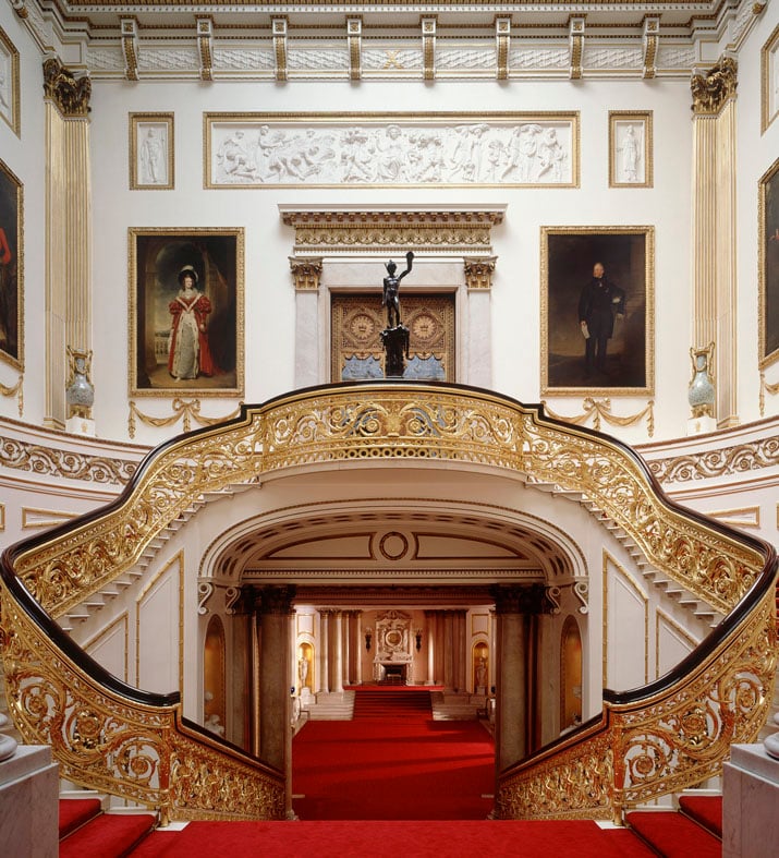 In regal colours of scarlet, jet black and gold, the modern and striking design evokes the highly decorated uniforms known as ‘liveries’ worn by State Coachmen and the guards of the Household Regiments at major royal events, such as the Coronation and Trooping the Colour. Apart from a few small details, livery remains much the same as it was in Victorian times, and many historic and modern-day examples can be seen on display at the Royal Mews at Buckingham Palace. The oldest livery on display dates from the 1919 procession to commemorate the end of the First World War and bears a strong resemblance to the striped rim of the plates.