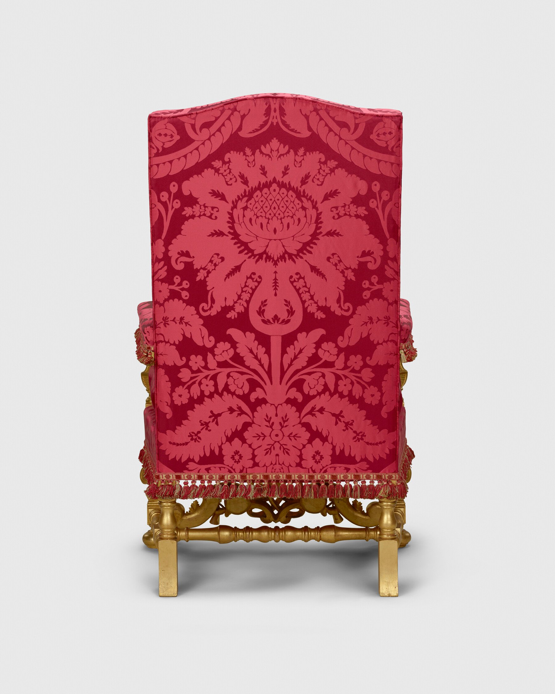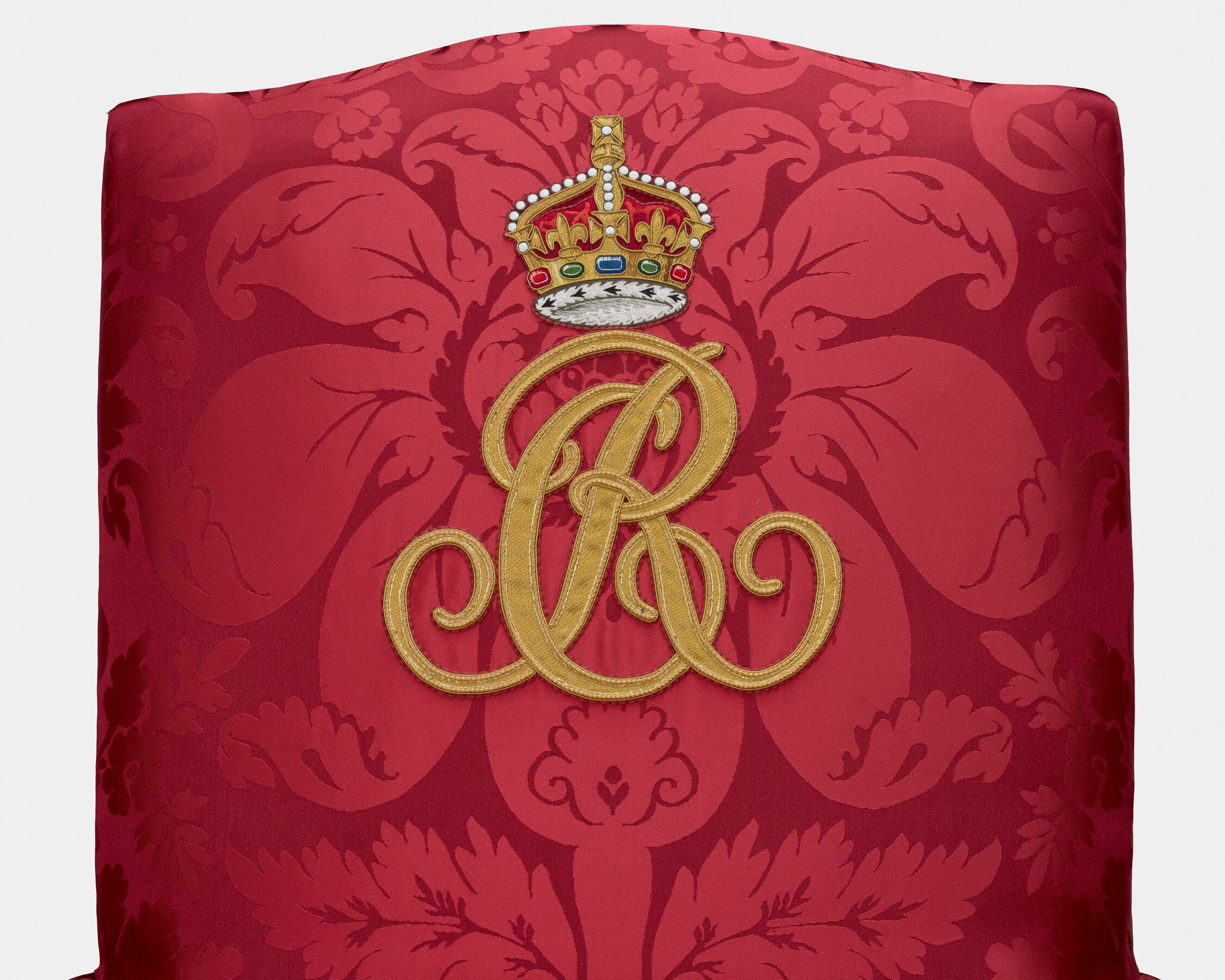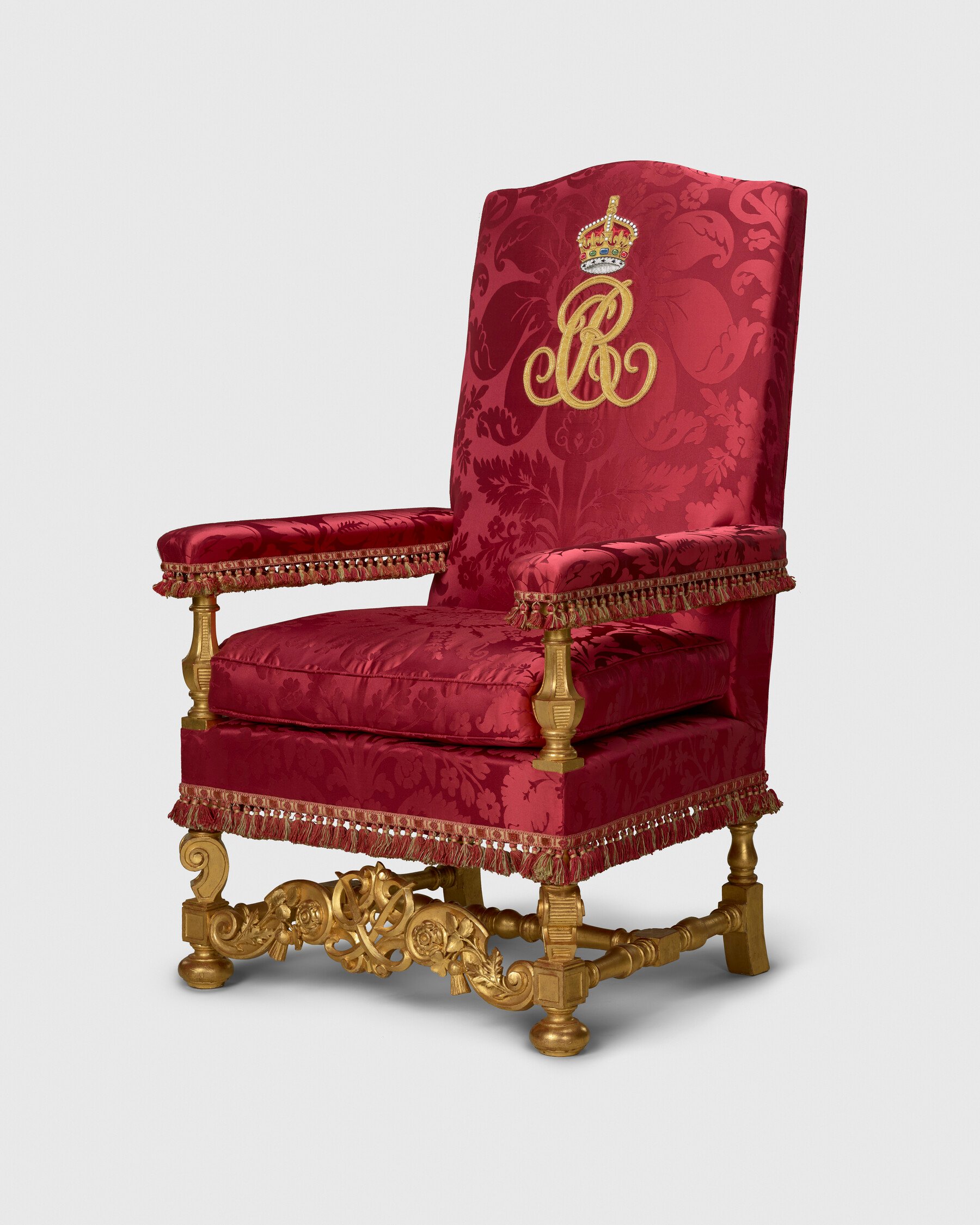 Their style is characteristic of English chairs from the late seventeenth century but with slightly lower backs to enable greater visibility of the sovereign. The high backs, scrolls and features in the balusters, front legs and pillars imitate shapes seen in metalwork and silver furniture of the period.The upholstery is of crimson silk damask in the Canterbury Rose pattern, including the cushion, with a tasselled fringing in white and crimson. Their upholstered arms are supported by turned gilt-wood balusters and the stretcher, which joins the two scrolled front legs, is carved with scrolls and has a cypher - ‘EIIR’ for Queen Elizabeth II on one chair, and ‘P’, for Prince Philip, Duke of Edinburgh, on the other, both enclosed by the Garter of the Order of the Garter.