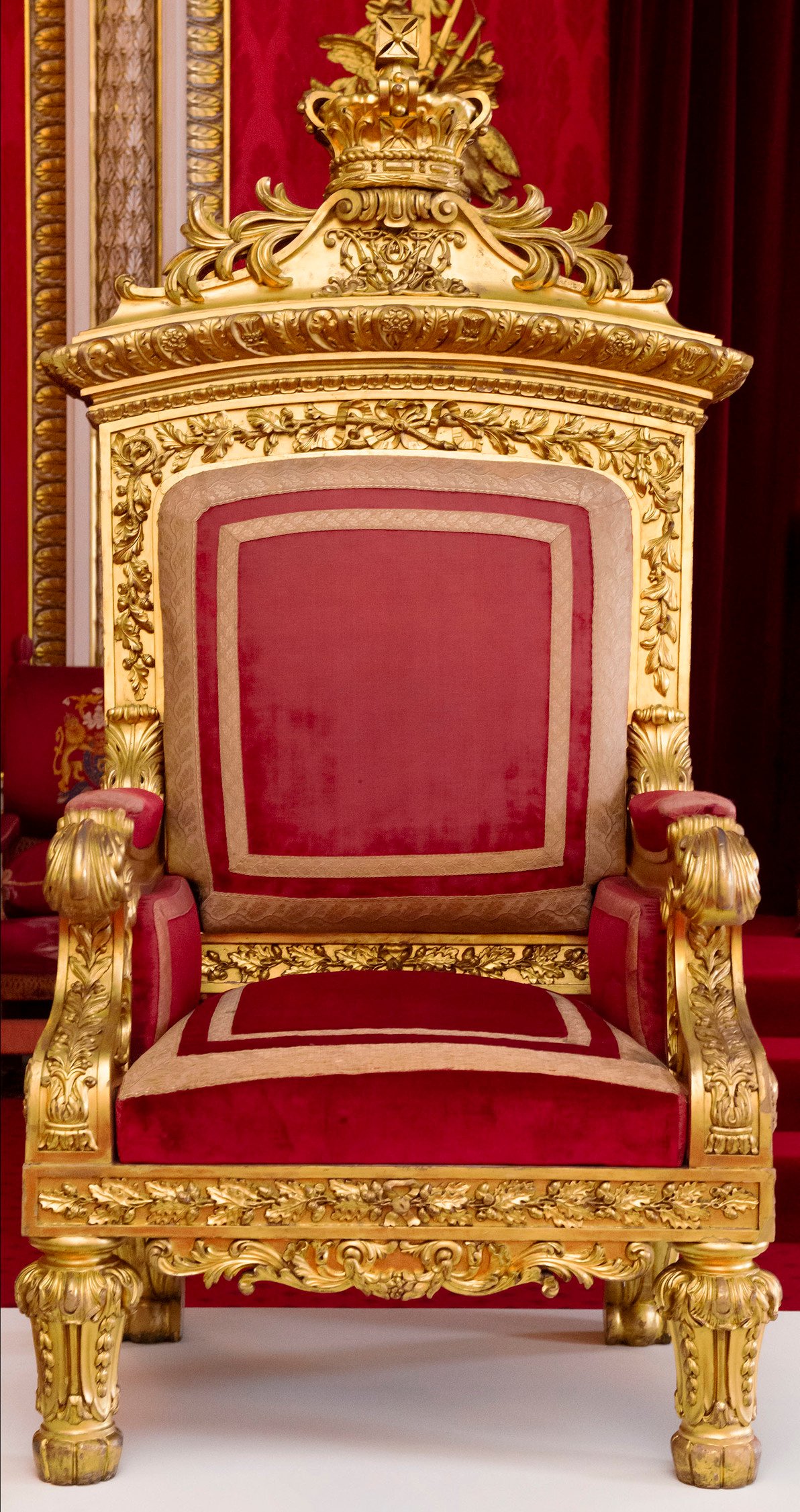 Throne chair of carved gilt wood, upholstered in crimson velvet and lacework; the top rail carved with a crown, VR cipher and national emblems; the frame of the chair elaborately decorated with foliage of oak leaves, acanthus scrolls, and berried laurel.